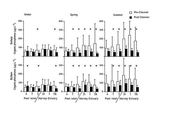 Figure 10: Mean organic phosphorus concentration from the six sites in the Peel Harvey Estuary during pre and post Channel years. The * represents a significant difference between pre and post Channel years. Site locations in Figure 1.