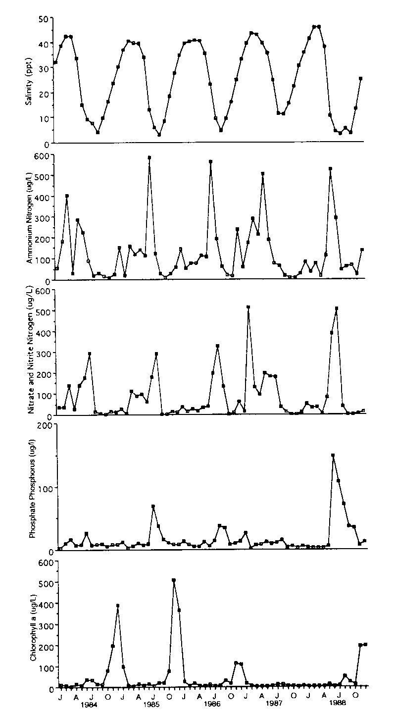 Figure 4. The salinity and inorganic nutrient concentrations of Harvey Estuary. The points are mean surface data for three representative sites along the length of the estuary.