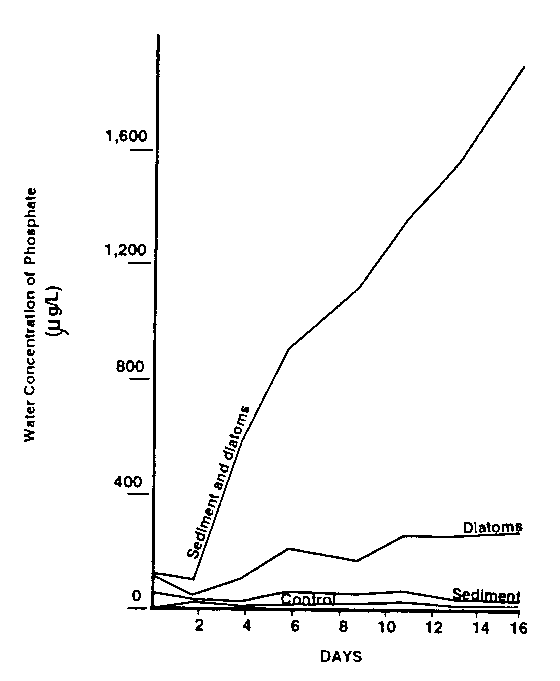 Figure 7. The effect of diatom detritus on the release of phosphate from samples incubated in the dark under laboratory conditions. Control = estuary water with no sediment; + diatoms = estuary water plus diatom detritus; Sediment = estuary water above a sediment core; Sediment + diatom = estuary water, sediment core, and added diatom detritus. (Data of Lukatelich.1)